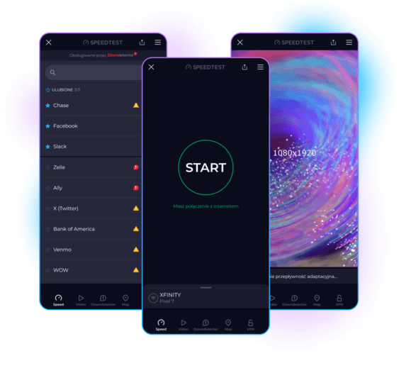 Naszą misją w Speedtest by Ookla® jest przyspieszenie internetu. W tym celu dostarczamy dane i badania na temat rzeczywistych prędkości internetu. Po przeprowadzeniu miliardów testów na całym świecie przedstawiamy Ci aplikacje na urządzenia, z których najczęściej korzystasz.